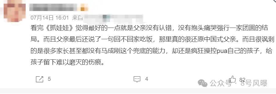 有影迷表示电影最好的一点就是结尾处父亲没有认错,不是抱头痛哭强行一家团圆的结局,而且父亲最后还说了一句回不回家吃饭,很还原中国式父亲,反讽效果拉满。