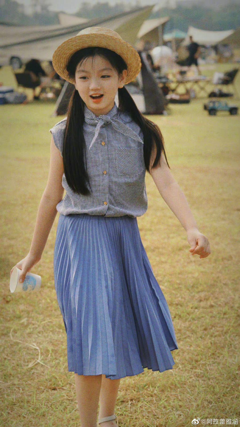 白天里,阿拉蕾扎着双马尾,戴着一顶圆形编织草帽。头发长长的,发质也很不错,在阳光下还泛着一点光泽。身上也穿着黑白格子无袖上衣,脖颈周围还打着一个复古的法式蝴蝶结。过膝的蓝色百褶裙,露出一小节小腿。整体穿搭让阿拉蕾有着她这个年纪该有的活泼但又带一些淑女感。
