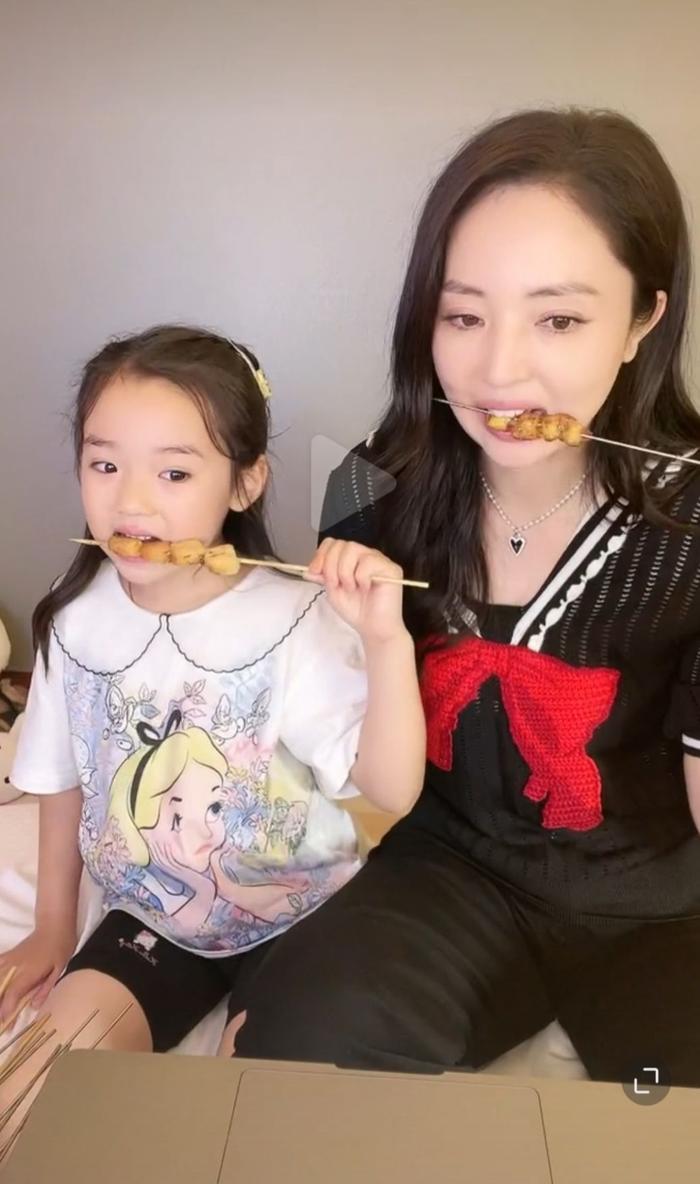 随后,两人一边吃着炸串,一边看着综艺,果真是印证了下饭综艺这一名号。而母女俩吃东西的动作也很同步,感觉连角度都一模一样。