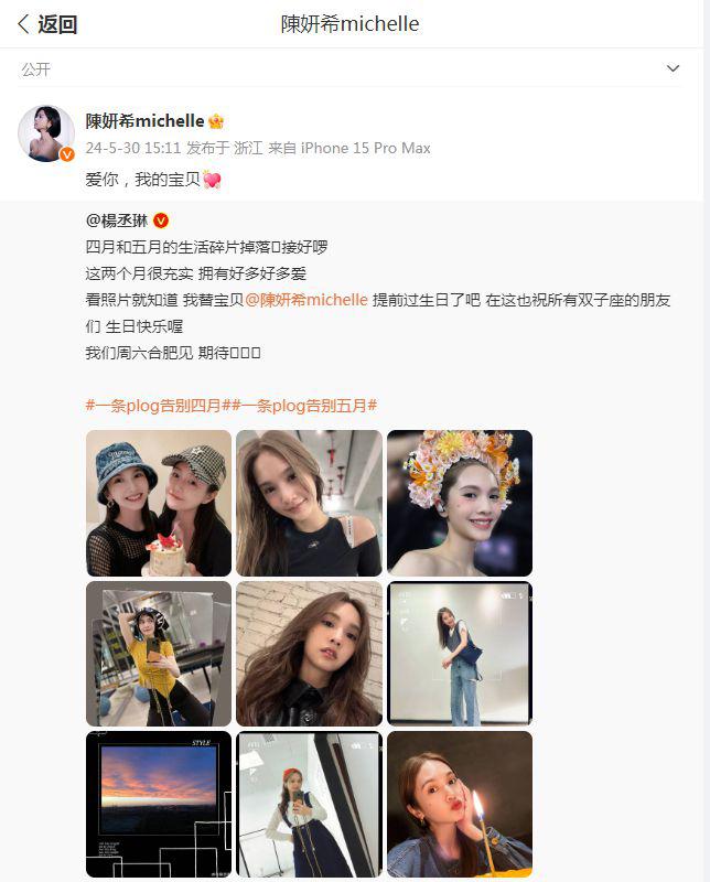 就在前一天,作为好姐妹的杨丞琳也晒出了一组十八宫格的美照,提前为陈妍希庆生,虽然也只有一张与陈妍希相关的合照,但是也依旧彰显了他们之间的姐妹情深了,更是直呼陈妍希为 " 宝贝 ",不知道陈晓看到之后,是否会吃醋呢?
