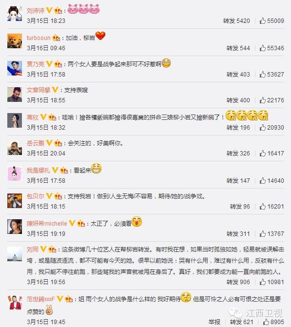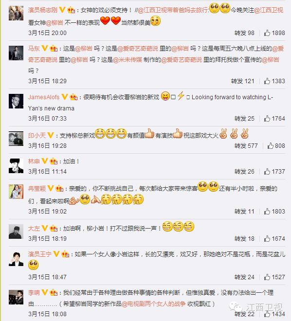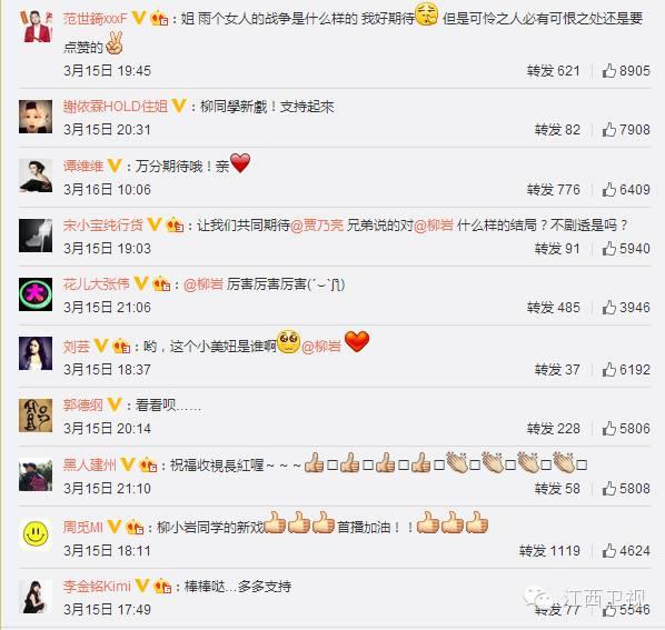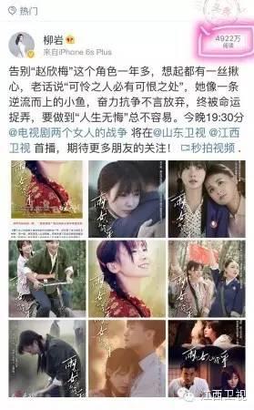当晚,wuli性感女神柳岩发微博预告新戏首播,她写到:告别“赵欣梅”这个角色一年多,想起都有一丝揪心,老话说“可怜之人必有可恨之处”,她像一条逆流而上的小鱼,奋力抗争不言放弃,终被命运捉弄,要做到“人生无悔”总不容易。今晚19:30分@电视剧两个女人的战争将在@江西卫视首播,期待更多朋友的关注!