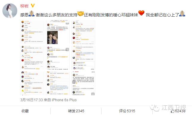 昨晚,wuli柳岩女神发微博感谢艺人朋友的支持,其中,还特意点到了咱们暖心的“邓超妹妹”。表示“感恩!谢谢这么多朋友的支持!都记在心上了!”