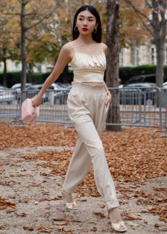 吊带搭配阔腿裤显示出的风格又性感又休闲,这种性感的缎面吊带上衣穿在身上也能够让她的皮肤看上去更白皙,而且穿在身上显示出了小蛮腰,下半身的阔腿裤穿起来会修饰腿型,显得双腿更长,再加上上短下长的技巧,也能够很好的修饰她的腰线,比例出众。