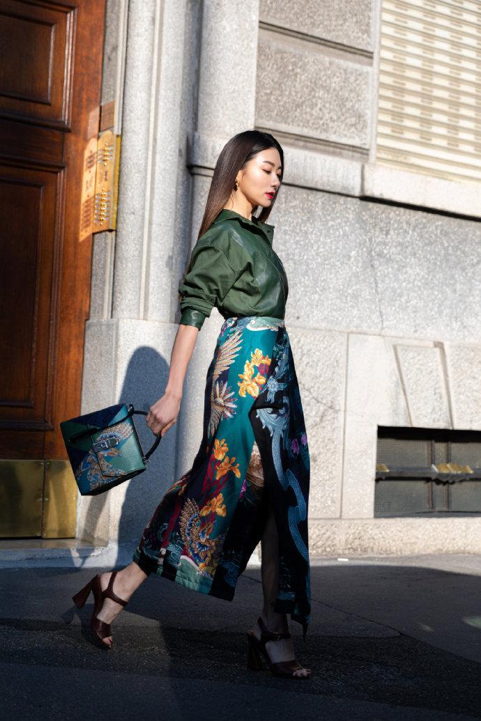 绿色衬衫搭配印花半身裙很文艺,这种印花半身裙的搭配也很浪漫,非常适合这个季节,但是对于不擅长搭配的女孩子来说还是有一些难以驾驭的,而且上半身的绿色衬衫也比较特殊,相比那些普通的白衬衫来说更个性,脚下搭配黑色高跟鞋,低调之中不乏高级感,非常值得借鉴。