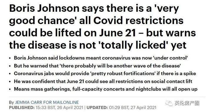 据首相鲍里斯日前透露,英国“极有可能”在6月21日取消所有对新冠疫情的限制,但他警告称,这种疾病尚未“完全被消灭”。