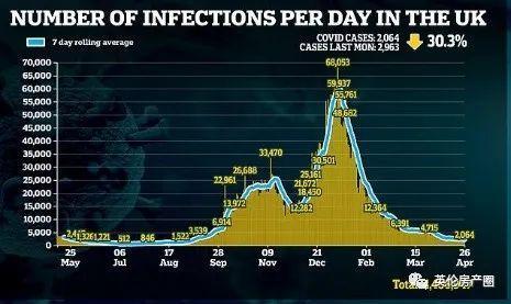 在疫苗接种计划推动的同时,英国的新冠感染人数已经大幅下降,昨日新增人数为2,064,较上周下降了30.3%。