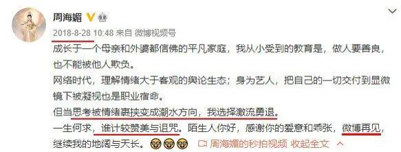 即便是宣布退网,周海媚言辞依旧温和,说自己理解网络时代的情绪大于客观舆论生态,身为艺人也愿意接受自己的一切都要被放在显微镜下凝视的职业宿命,但当思考被情绪裹挟失控,她选择急流勇退。
