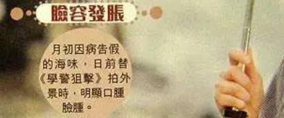 复工后的周海媚被港媒拍到过手指关节出现红、肿、结节等发炎,疑似旧病复发的症状,脸也被拍到浮肿肿胀的不佳状态。
