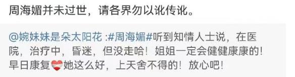 但随后有媒体人公开辟谣说周海媚没有去世,还有知情人表示周海媚是老毛病复发送往医院治疗已经转危为安,还有人说她虽然昏迷中但情况稳定,这些说法又让人稍微放下了心。