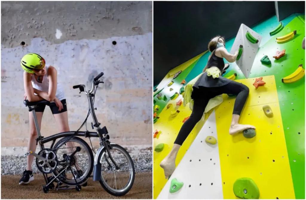 户外骑行,室内攀岩,常年健身的她肌肉线条依然明显: