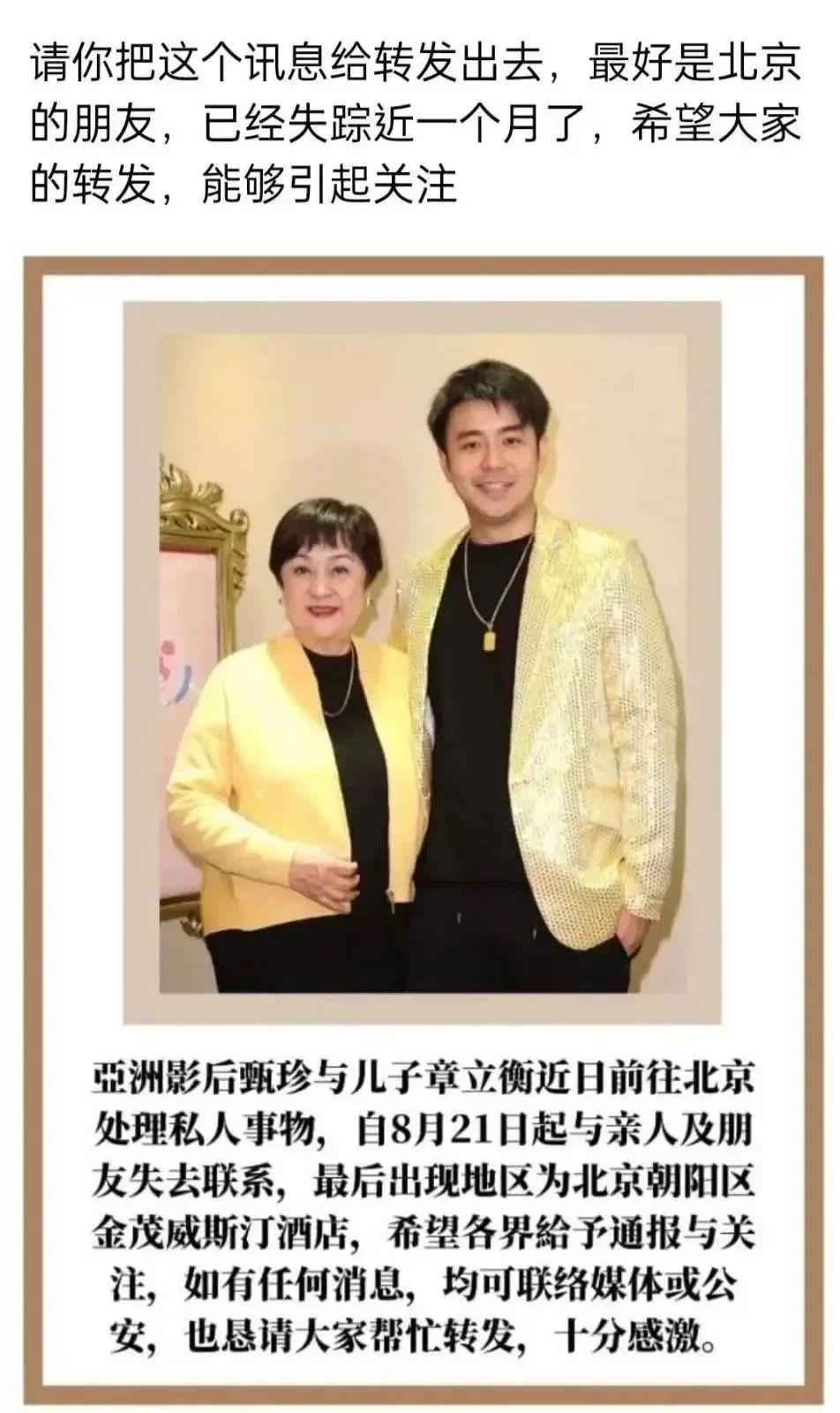今年已经 74 岁的甄珍与儿子同行,有传闻称是去处理与刘家昌的案子。但是人到了北京之后行踪成谜让亲友相当担心,虽事后有在朋友圈发文,不过却始终未露面,甚至连甄珍的亲妹妹,歌手银霞都联系不上不上她,近日银霞不得不发文以表自己的思念之情,坦言 " 这很异常 "。