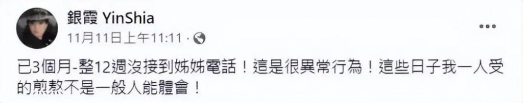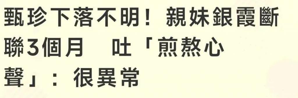 银霞表示自己已经三个月,12 周没有接到姐姐的电话了,这些日子自己一个人受的煎熬,不是一般人能够体会,可见对姐姐甄珍的思念以及担心。而且此前甄珍被曝失联的时候,银霞也发文隔空喊话姐姐。就在上个月,有媒体报道甄珍母子已经失联四十多天,外界联系不到母子二人。