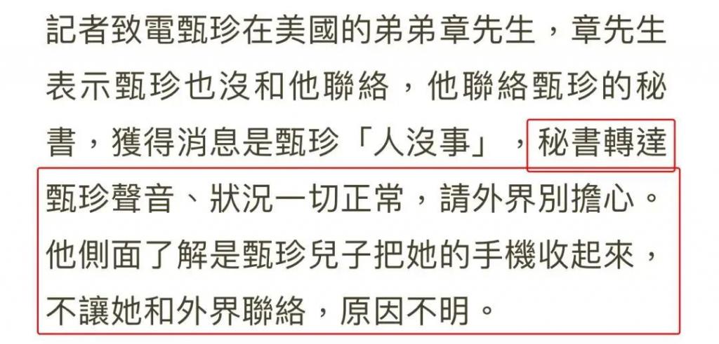 至于人身安全,甄珍远在美国的弟弟吐露,通过联系甄珍的秘书得知姐姐人没事,之所以没有与亲人联系,是因为儿子章立衡把手机收走了,不让母亲与外界联系。