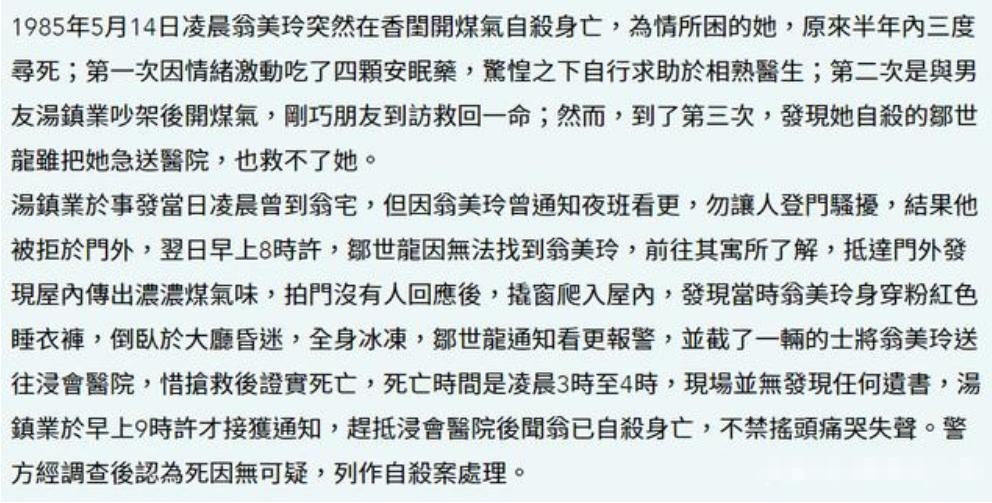 通过这两段迟来的爆料,翁美玲的真实死因似乎逐渐水落石出。