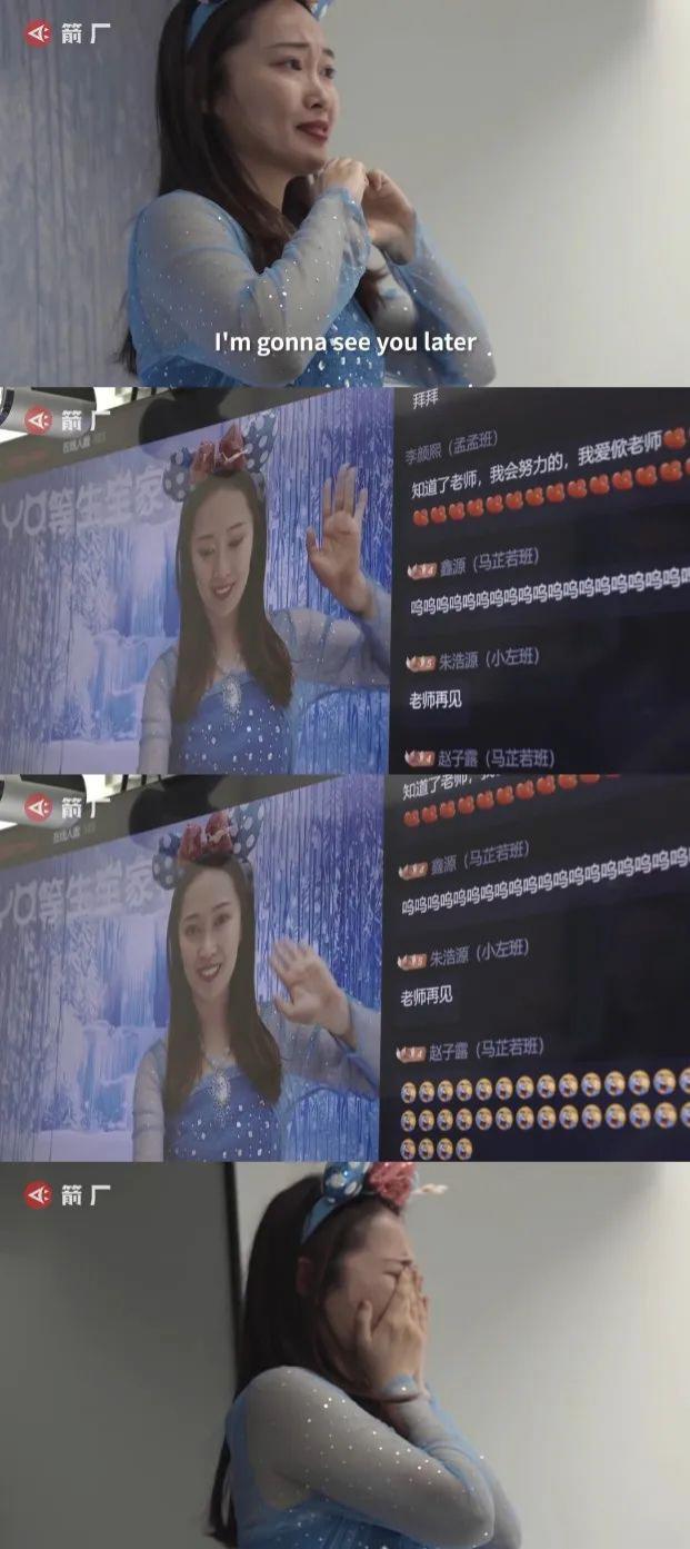 2025 年的最后一天,她穿着迪士尼公主裙,在线上上完了自己作为老师的最后一堂课。课程结束,她像往常一样和孩子们告别:"I'm gonna see you later(之后见)." 话音刚落,她便控制不住自己的情绪,双手蒙着眼,哭了起来。