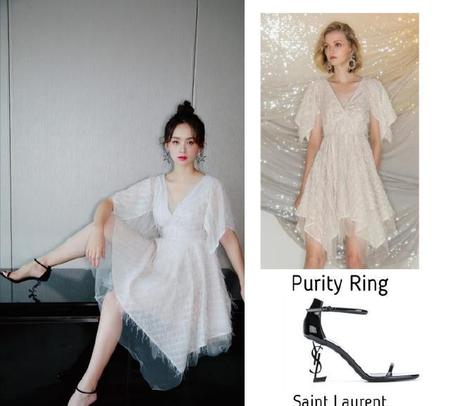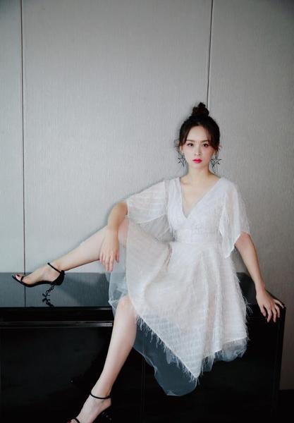 从邓莎的这一身装扮来看,女神形象满满。紧随时尚的她,脚上穿的是一双YSL的高跟凉鞋,黑色的配色优雅而显瘦,身上穿着一件V字领口的白色连衣裙,透视感,毛须边的修饰,将邓莎的仙女气质衬托的十分完美,扎起丸子头来,甜美又可爱。