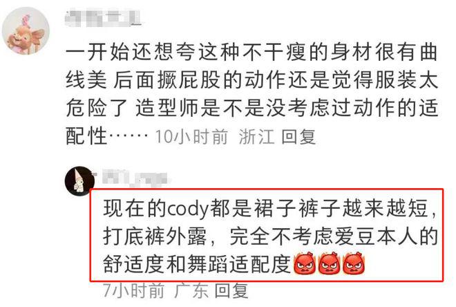 更为嘲讽的是,网友发现田小娟造型尺度之所以比宋雨琦更大,并不是因为宋雨琦是中国人,更有可能是田小娟个子更矮,身材比例也不如宋雨琦,需要通过更窄的裤子和更多的露肤度还制造视觉差,好让田小娟的腿显得不那么短。