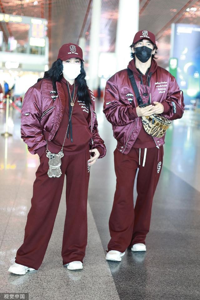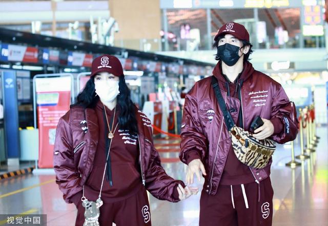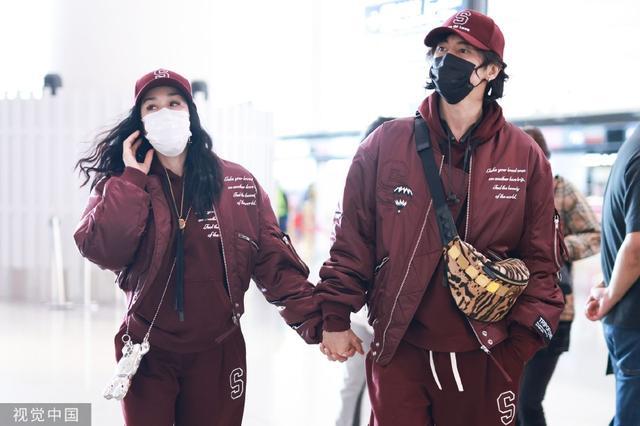 钟丽缇夫妇穿情侣装从首都机场出发 对镜做比心手势