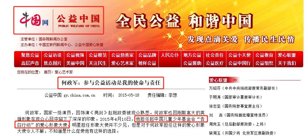 2.原文登载于公益中国 2015年05月18日 关于“何政军:参与公益活动是我的使命与责任”的报道
