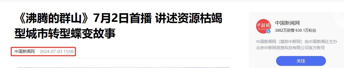 3.原文登载于中国新闻网 2024年07月03日 关于“《沸腾的群山》7月2日首播 讲述资源枯竭型城市转型蝶变故事”的报道