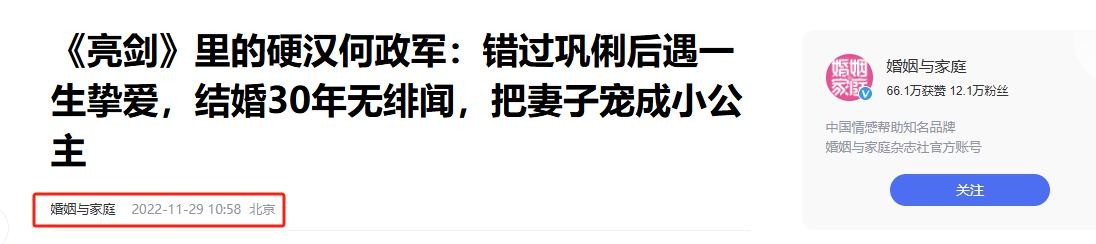 1.原文登载于婚姻与家庭杂志 2022年11月29日 关于“《亮剑》里的硬汉何政军:错过巩俐后遇一生挚爱,结婚30年无绯闻,把妻子宠成小公主”的报道