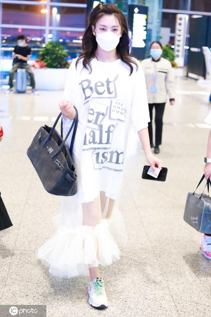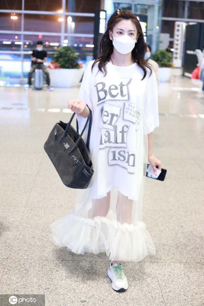 长款字母印花Tee+拼接薄纱蛋糕裙+爱马仕包甜美可爱.