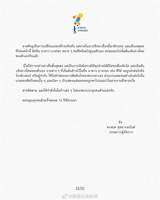 直至今日,我司旗下的大部分艺人都已经成长,可以决定自己的职业生涯、选择经纪公司及未来发展的道路,是时候该停止Nadao Bangkok及Nadao Music旗下的艺人经纪、影视剧制作和音乐制作的业务了。