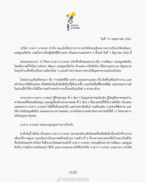 泰国头条新闻社讯 5月10日, 泰国著名娱乐经纪公司Nadao Bangkok官方发布公告称,将自2025年6月1日起,停止艺人经纪运作、影视剧制作和音乐制作业务。