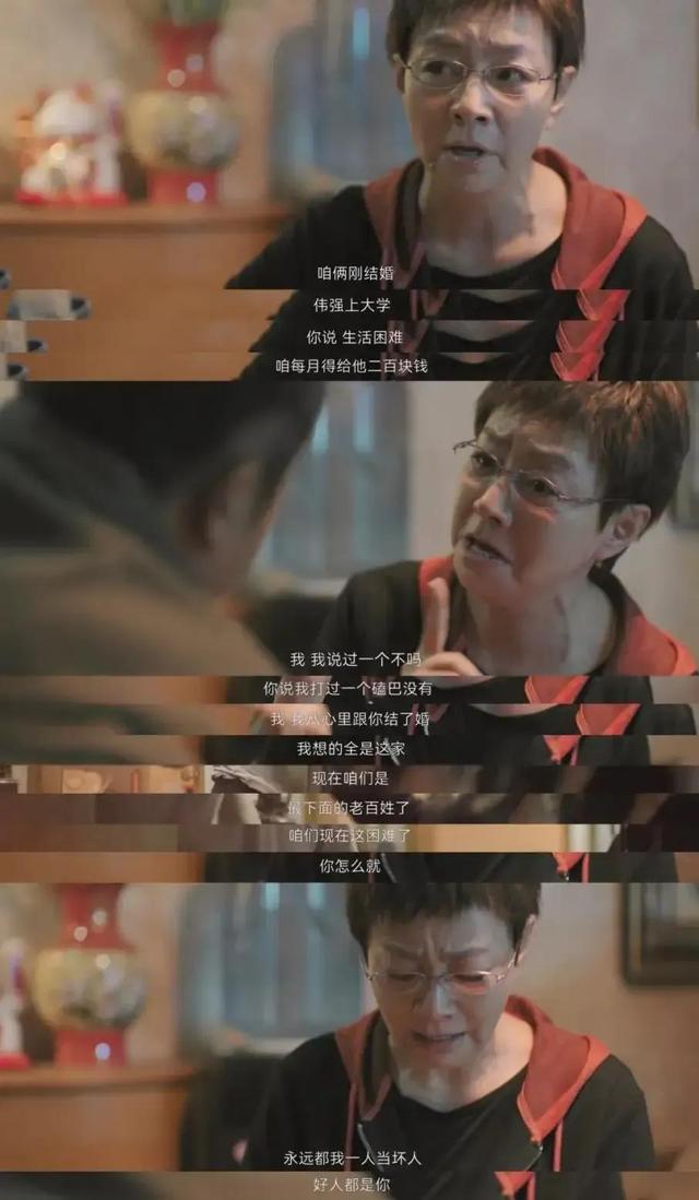 郝蕾饰演的张春梅为家里操碎了心,却不被认可,这个戳到了嫂子二琥的心,因为她虽然 " 嘴利 ",办事儿也总是 " 市侩 ",可归根结底都是为了小家着想啊。