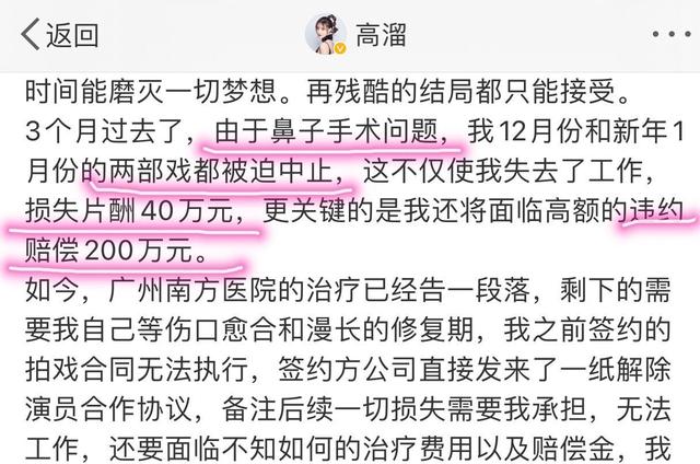 按照高溜原本的计划,完成鼻子整形后,她将进组拍新戏,而新戏将会为她带来40万的收入。