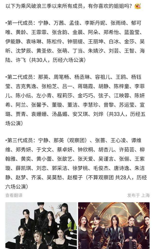 《乘风破浪的姐姐》几季的名单都是公开的,我们点开以后就能发现,在第一季里W姓的女明星并不多,随便一搜都能看到只有吴昕、王丽坤、王霏霏、王智、万茜这几个女明星符合条件。