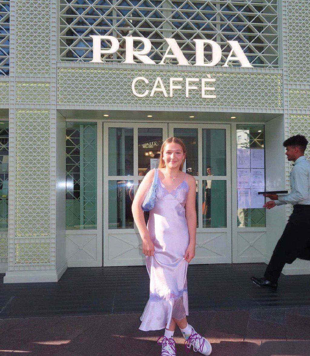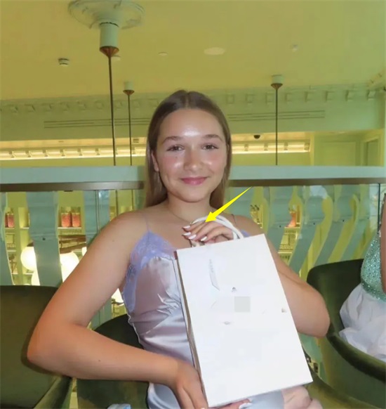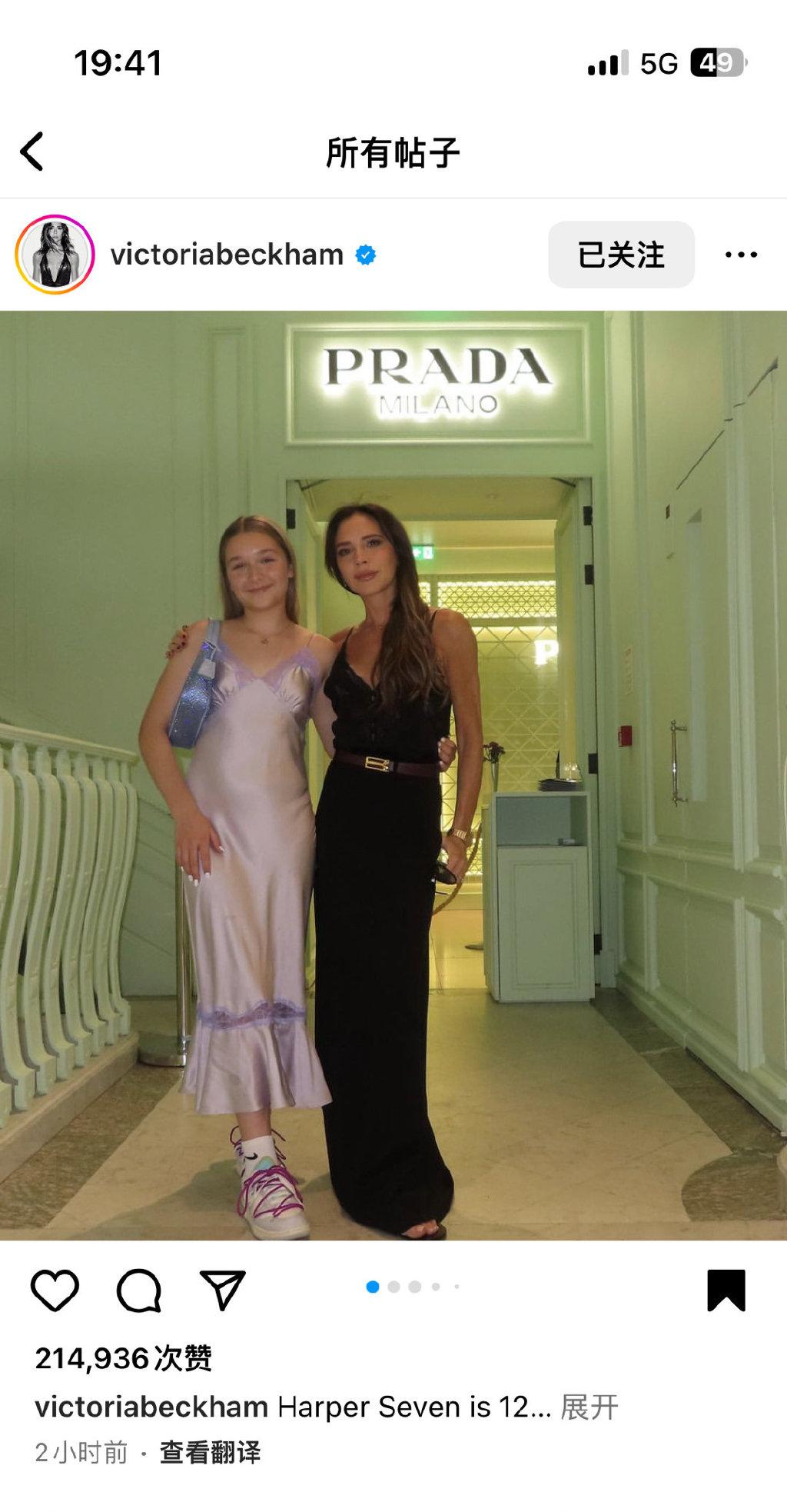 仔细看小七不止穿着蕾丝吊带裙,手上还涂着白色的指甲,打扮得相当成熟。不止如此,她的身高也逼近母亲维多利亚。