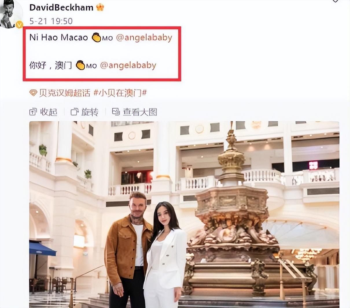 今年5月,贝克汉姆中国行与Angelababy一起拍摄广告,两人还在酒店相谈甚欢。去年世界杯,贝克汉姆也是形象代言人。