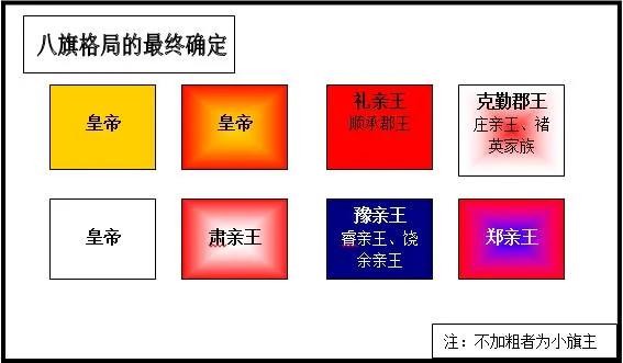 经过皇太极、多尔衮、顺治时期多次政治地震,最终上三旗归于皇帝,正红旗归于代善家族、萨哈廉家族(代善嫡三子),镶红旗归于岳托家族(代善嫡长子)、褚英家族、硕塞家族(皇太极侧妃儿子),正蓝旗归于多尔衮家族、多铎家族、阿巴泰家族(努尔哈赤侧妃儿子),镶蓝旗归于济尔哈朗家族,镶白旗归于豪格家族。上述这几家,就是八大铁帽子王,加上几家铁帽子公爵,没有一个是庶出,全部是嫡妻所生,至少是地位稍低的侧妃所生,典型子凭母贵。所以说,八旗旗分分配,起决定作用的是老婆们,老婆地位决定了部属和财产分配,母亲地位决定了儿子地位!