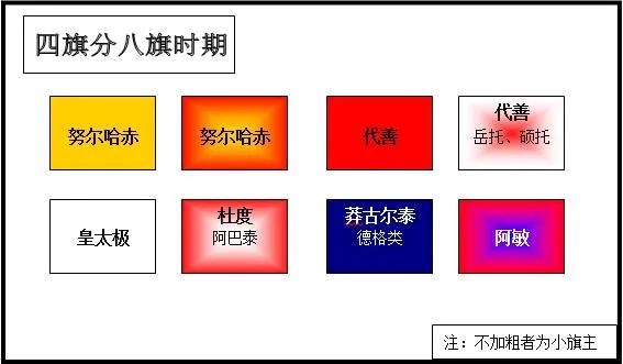后来四旗扩编成八旗,努尔哈赤、代善分别统领两黄旗、两红旗,嫡出儿子陆续成年,新编正蓝旗归努尔哈赤继妃富察氏儿子莽古尔泰、德格类兄弟,正白旗归继妃叶赫那拉氏儿子皇太极,镶白旗由长子褚英的儿子杜度继任,侧妃儿子阿巴泰则分得牛录,成为镶白旗的小旗主,还是母亲地位决定儿子部属和财产分配。这样努尔哈赤所有正妃的儿子,以及地位稍差的侧妃的儿子都拥有了相当旗分,成为八旗的大小旗主,努尔哈赤一家独占八旗中的七旗。
