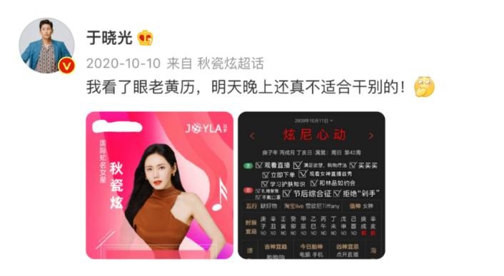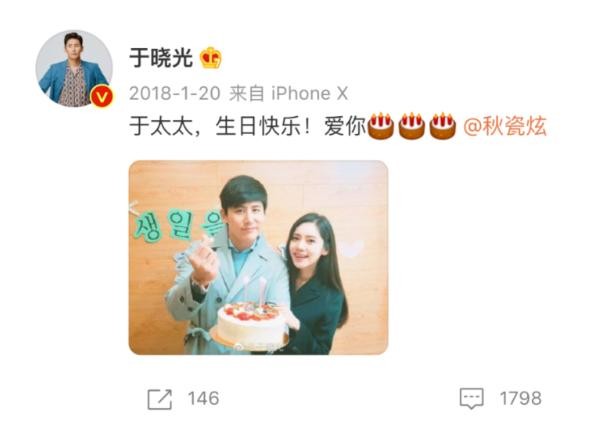 而我们再来看看于晓光的社交动态,与老婆秋瓷炫有关的内容还在去年10月份,之后便再也没有发过有关秋瓷炫的任何博文,甚至在今年1月份秋瓷炫的生日,于晓光都未曾提及,也被网友质疑到两人感情早已生变。