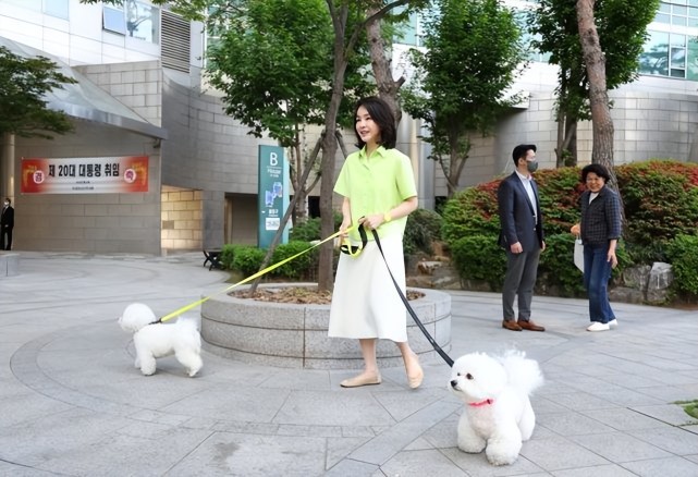 金建希在不同场合的造型风格完全不同,毕竟家中养了4条狗三只猫,总统夫妇两人还经常外出遛狗。