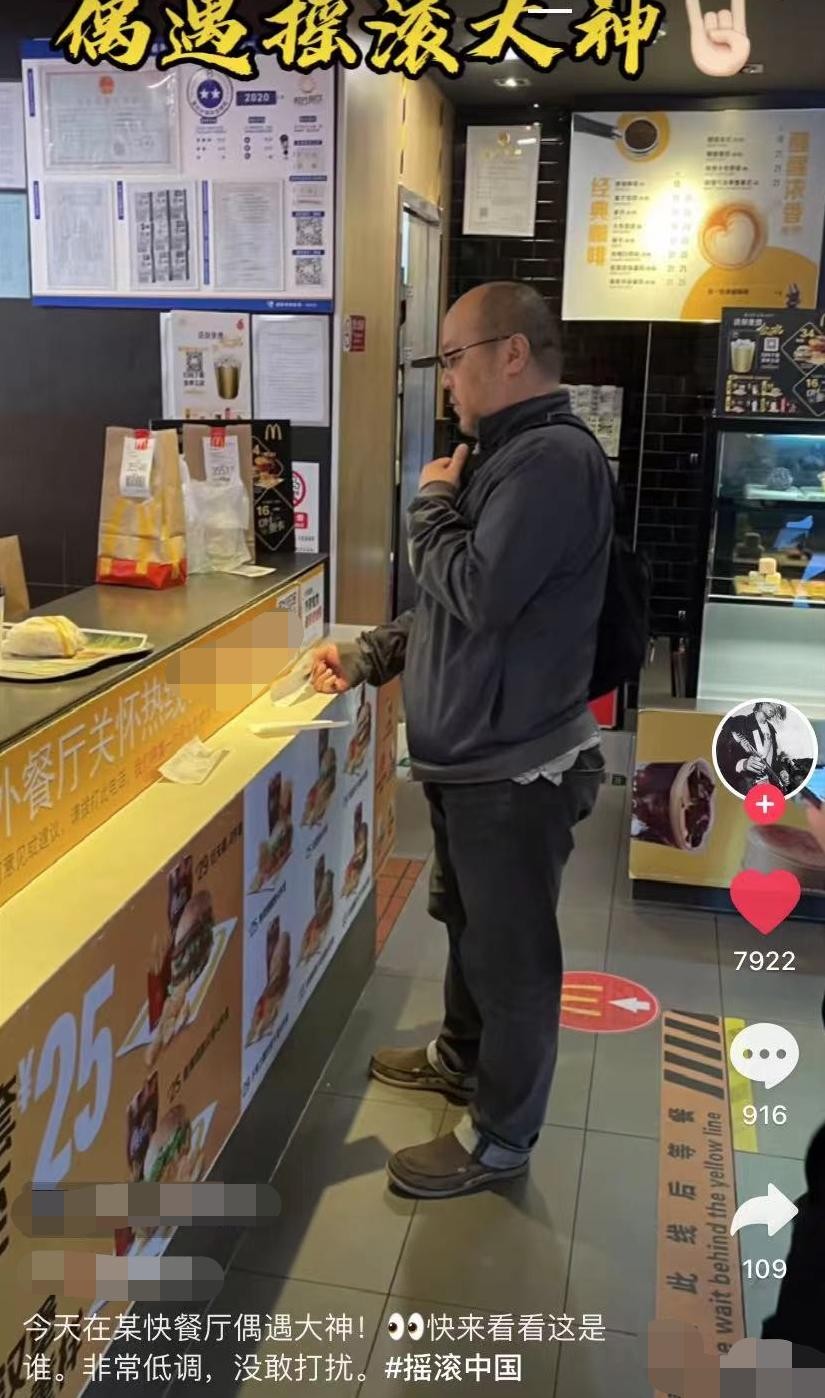 5月29日,有网友在某快餐店偶遇窦唯,并表示:“偶遇摇滚大神,非常低调,不敢打扰。”