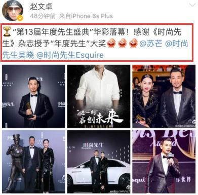 就在刚刚(12月8日),赵文卓在微博上晒出一组图片,祝福自己获得某杂志评选出的年度“时尚先生”