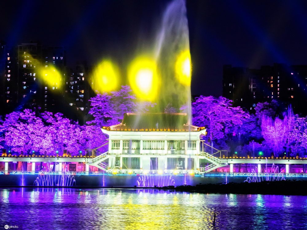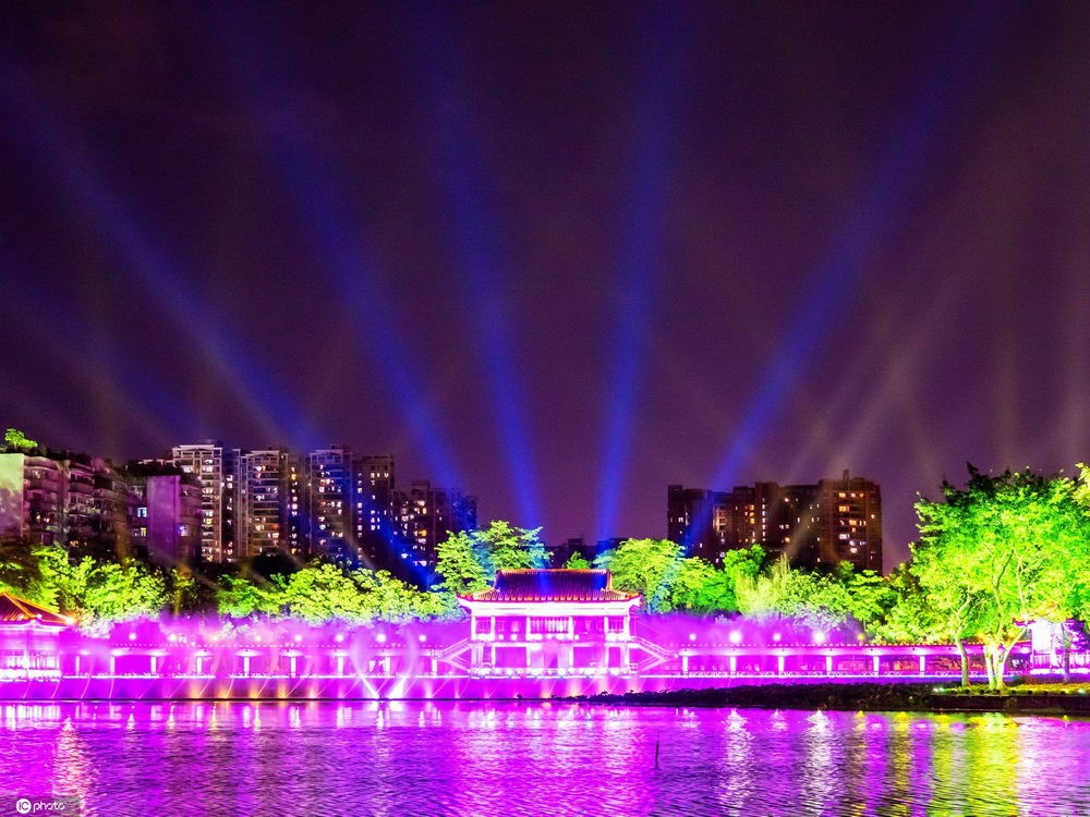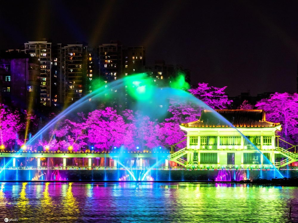 2020年7月17日,广东广州,广州举办“广州欢迎你”文旅助力百业复兴系列活动。将以“水幕灯光秀”打响头炮重新闪亮登场,荔湾湖公园五秀湖将再次上演绚丽多彩的水幕灯光秀,在波光粼粼的湖面上将岭南文化核心区最美的西关风情展现在游客眼前。