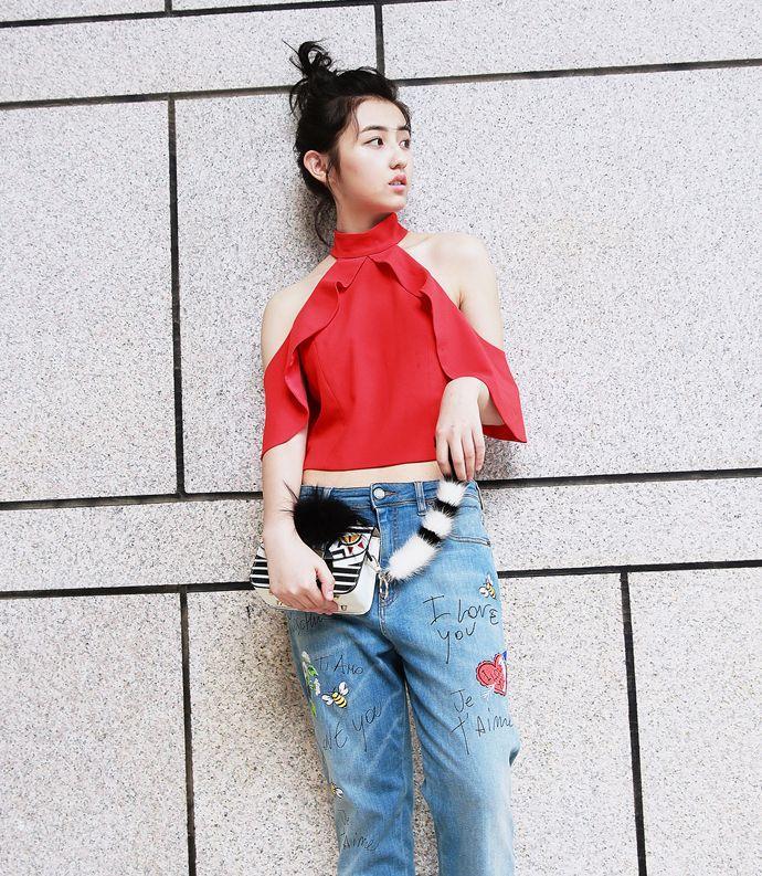 张子枫身穿红色露肩上衣,搭配蓝色牛仔裤,头发随性梳成丸子头,清新少女感满满