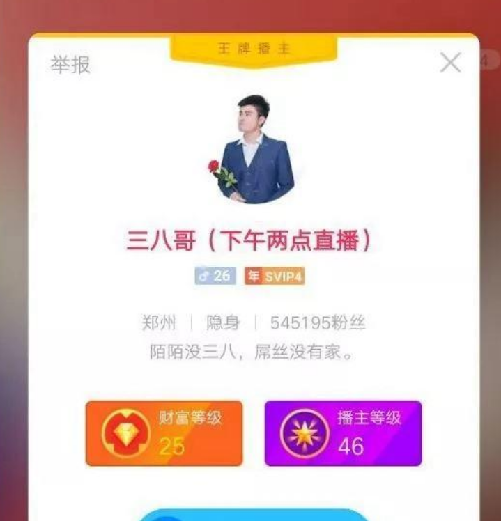 三八哥算是陌陌平台比较励志的一个主播了,农村出来的穷小子,现在月入几十万。短短的几个月粉丝暴增几十万,火速升到31级,陌陌第一季度年度比赛前十名,有着陌陌第一“雷公”之称。