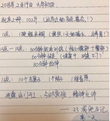 袁姗姗在微博晒出自己第一天减肥的手写日记,从日记中可以看出只有102斤的袁姗姗其实并不算胖,不过,“马甲线女王”终究是“马甲线女王”,所以,相比其他明星“饿加运动”的一句话减肥口诀,袁姗姗制定了更详尽的减肥计划。