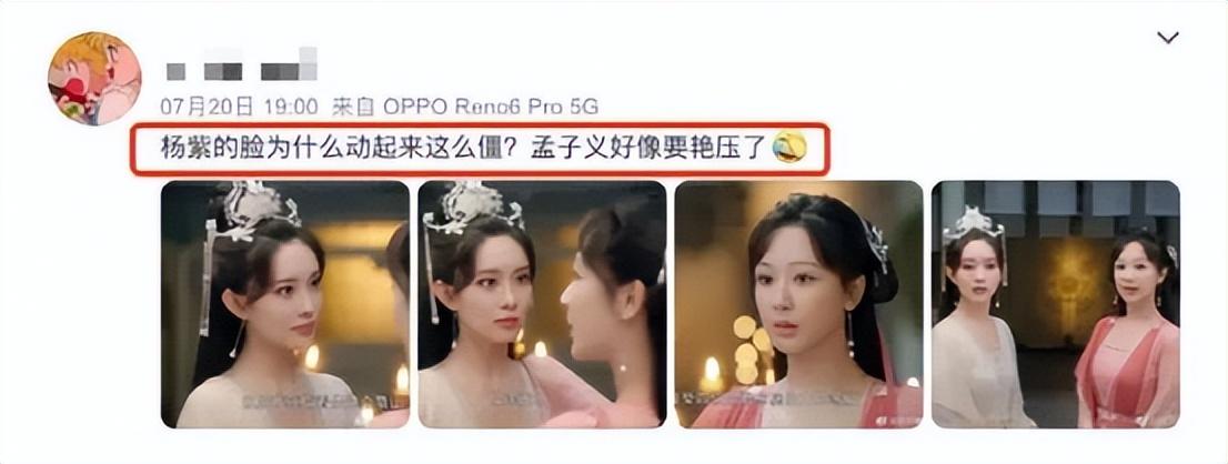 之前在《余生》和《沉香如屑》中,杨紫就被人发现在剧中镜头,下巴有一个明显的小凹陷,这让网友直呼太出戏,影响到了剧情观感,和孟子义同框的时候,也被人吐槽脸部很僵硬,妥妥地被孟子义艳压。