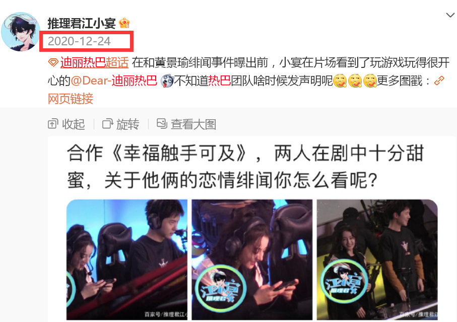 的确,狗仔从2020年便在拍到迪丽热巴时便时不时cue到黄景瑜,之后更是一路爆料迪丽热巴怀孕,这次在蔡徐坤事件中随口一提迪丽热巴,再度令其冲上热搜。