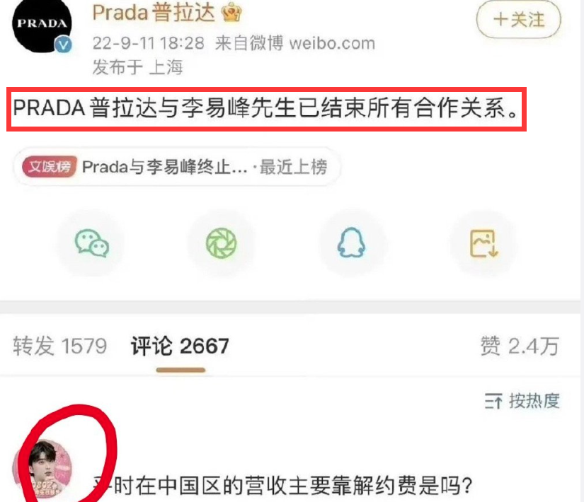2022年9月,普拉达宣布和李易峰解约。吃瓜群众各种戏谑,其中便包括了蔡徐坤的粉丝。