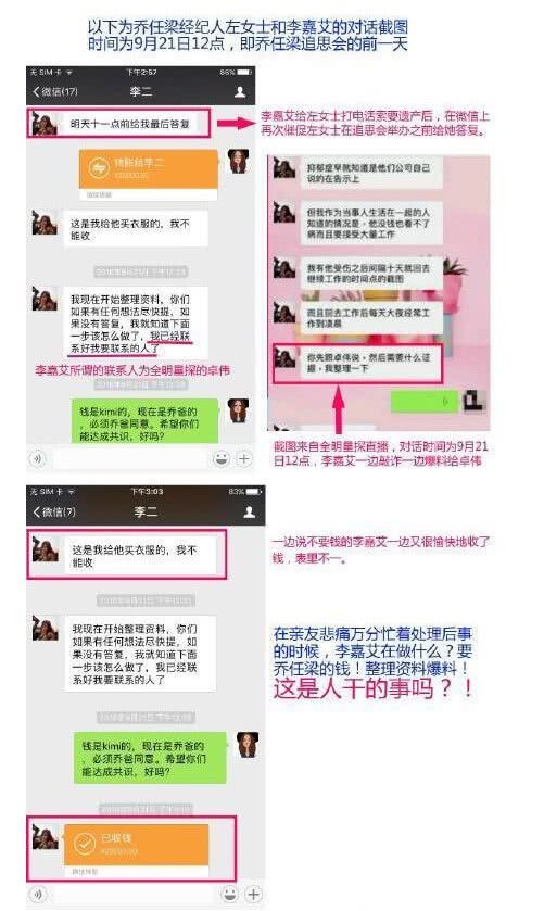 据悉当初乔任梁离世之际,亲友万分悲痛忙着处理后事的时候,这位叫李嘉艾的女士却打电话给乔任梁家人要遗产,还拿着乔任梁的手机给自己转了3笔钱,乔任梁家人还发布了一则声明直指这位女士,希望不会再和这位嘴里说着爱,却做着屡屡伤害乔任梁家人的人再有任何交集了。