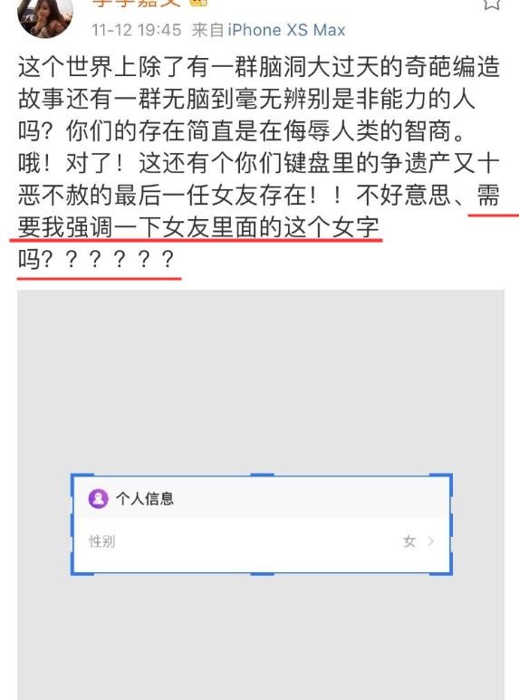 从这段文字可以看出,她对于网上的风言风语也是忍无可忍才会这样的破口大骂,最后她还表示,这还有个你们键盘里的争遗产又十恶不赦的最后一任女友存在。不好意思,需要我强调一个女友里面的这个女字吗?