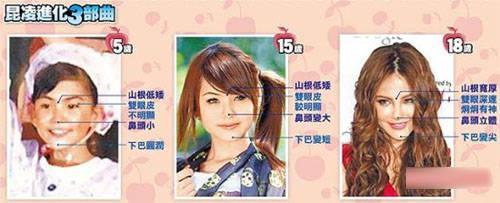 外界认为昆凌下巴变尖、山根宽厚、双眼炯炯有神,与小时候相差很大,整容医师张炯铭分析,女性下巴从10至14岁之后才开始发育,她小时侯下巴就长,长大后因变瘦,下巴才显尖,但张炯铭认为:“她小时候山根低矮,不可能再往上长,打玻尿酸就会有宽厚效果,她小时候眼晴泡泡的,双眼皮不明显,但现在她双眼皮却很明显,可能是化妆效果吧。”对此她的经纪人FiFi表示:“她没有整容,现在化妆技术这么好,有机会也可让记者摸鼻子。”