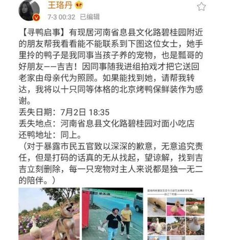 果然不幸被网友猜中,7月4日上午十点,王珞丹又发了一条博文,大意是抓她朋友鸭的人已经找到了,但鸭子再也回不来了,同时呼吁大家不伤害、不食用别人家的宠物。